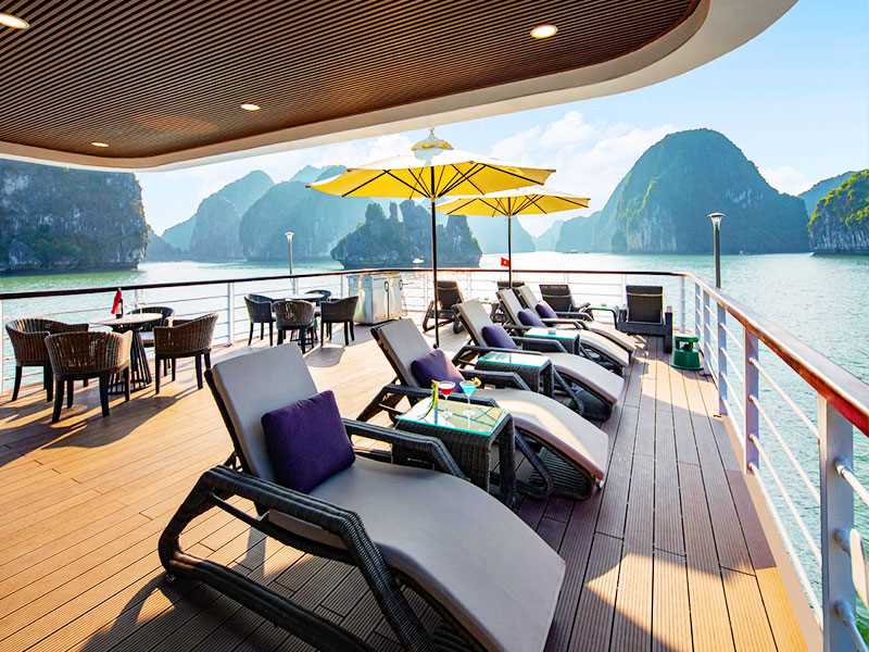 16:30 - A sunset gathering is planned, providing a period of leisure. Guests are encouraged to ascend to the sundeck to witness the scenic sunset above the bay and join the sunset party. This is an ideal setting for socializing, sharing travel experiences, or simply admiring the sunset while the vessel heads back toward Tuan Chau Marina. Alternatively, passengers may relax in the jacuzzi at the bow of the cruise ship.