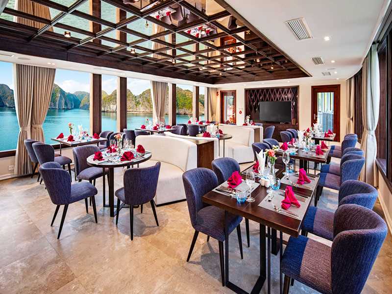 Guests will dine in an air-conditioned restaurant while cruising amidst the towering limestone karsts. The buffet features diverse options of Western, Vietnamese, and seafood dishes, accompanied by stunning views through expansive windows.