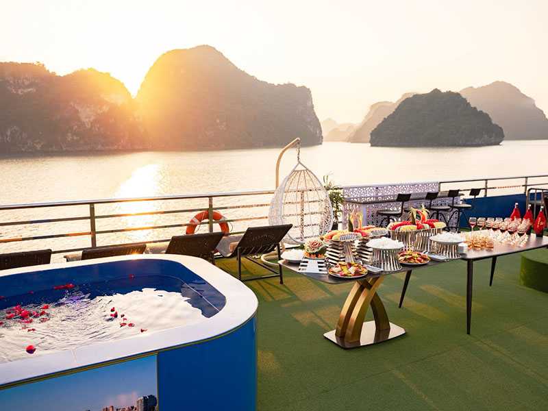 17:30 - Cruising back to Halong International Cruise Port. Relax and enjoy the sunset party with tea, cakes, sunbathing on the upper deck, music, and fun interactions with fellow travelers among the world’s iconic natural scenery.