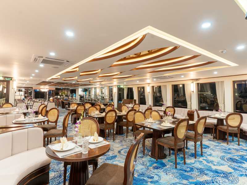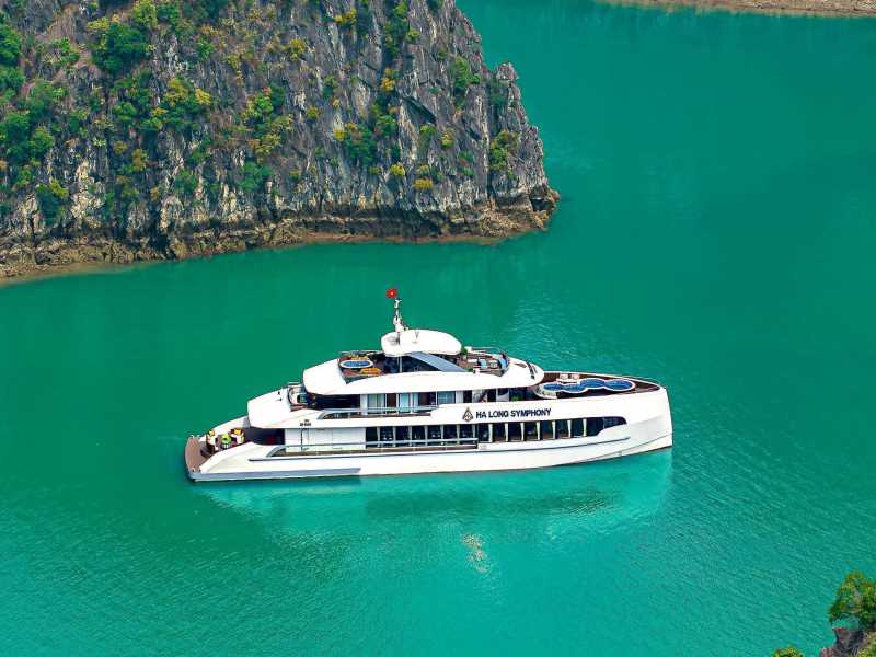 Halong Symphony Cruise is the latest 5-star vessel to grace the waters of Halong Bay, showcasing a contemporary design and standout amenities such as chic Jacuzzi pools. Dressed in elegant deep blue tones,HALONG SYMPHONY CRUISE harmonizes perfectly with the stunning natural scenery of this UNESCO World Heritage Site. Guests are invited to experience true luxury and refined comfort while discovering the majestic beauty of Halong Bay aboard this exceptional new cruise ship.HALONG SYMPHONY
